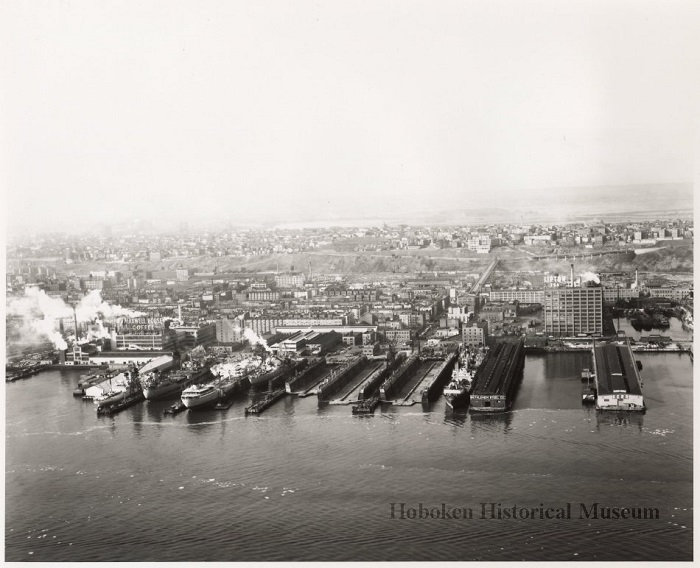 碼頭左方是麥斯威爾咖啡工廠,右方是立頓紅茶,攝於1955年。圖片來源︰Hoboken Historical Museum